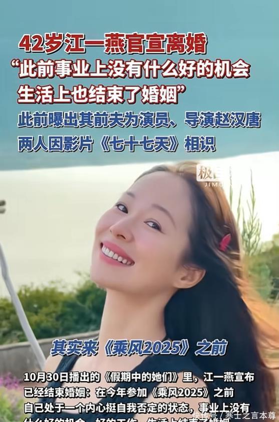 有的网友认为: 事实证明已婚女星只要重新出来工作,那基本婚姻应该是破碎了,前几年才传江一燕跟赵汉唐隐婚还有两个孩子,明星的婚姻好难长久哦。。。 有的网友认为: 2019年女儿早产,2022年才承认已婚,2025年5月还被拍全家出行,结果5个月后突然说离婚!